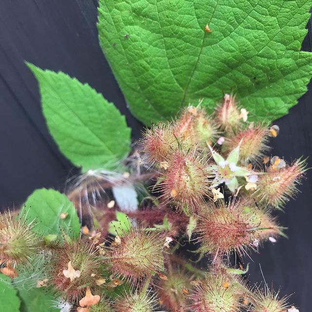 Det vetenskapliga namnet på latin för vinhallon är Rubus phoenicolasius, på svenska kallas de ibland för japanska vinhallon synonymt. Grenarna kan bli ca 2 m långa och får ett liggande växtsätt om du inte binder upp dem. De skickar upp en hel del rotskott och beter sig lite som björnbär och odlas ungefär likadant men tänk på placeringen! Ge dem ordentligt med utrymme och sätt dem helst inte där du passerar ofta och nära för de är inte så gosvänliga direkt… Grenarna är extremt täckta av massvis med små taggar som sitter tätt. Men ändå snygga plantor, de känns lite exotiska på nåt vis. Särskilt när bären kommer i stora tunga klasar! 🙂