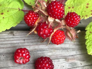 Smaken på japanska vinhallon är väldigt olika beroende på hur pass mogna bären blivit… Ju mognare desto sötare, så ha inte för bråttom med skörd. Smaken brukar beskrivas som en korsning mellan hallon och björnbär ungefär. Som omogna smakar de som vattniga, svagmilda, extra fasta hallon ungefär. Ju mognare och sötare de blir, desto mer framträder lite björnbärssmak. Eftersom jag tyckte att de vagt påminde om allåkerbär i utseendet (själva bären alltså, inte plantan) så hoppades jag att de kanske eventuellt skulle påminna om dem i smaken också, men tji fick jag. De ser mer tropiska ut än vad de smakar. Men goda! 🙂