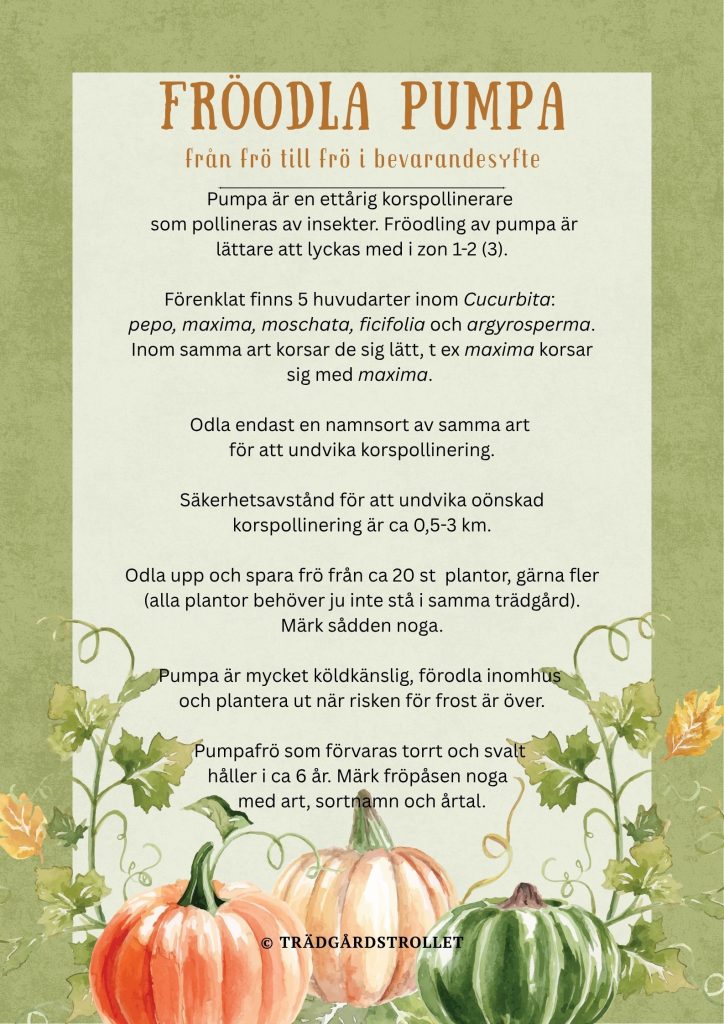 Att ”kortsiktigt” odla upp pumpa för konsumtion och bara spara lite frö till sig själv är det nog många som redan gör men om du vill fröodla pumpa långsiktigt hållbart, i bevarandesyfte så att namnsorten fortsätter finnas över tid, så är det lite mer att tänka på. Då ska du gärna spara frö från så många plantor som möjligt, bara odla en art av släktet Cucurbita (t ex bara odla en namnsort av Cucurbita pepo, för att slippa oönskad korspollinering, pepo korsar sig med pepo), pollinera flera olika plantor av samma namnsort med varandra och ev selektera om det behövs. Det innebär att du behöver välja en art och namnsort som trivs i din odlingszon och som hinner mogna hos dig. Att du behöver ha gott om plats för många plantor i odlingen OCH att du behöver ha gott om plats inomhus för eftermognad av frukterna. Om du inte har plats för 20 st plantor då…? Då kan du samarbeta med andra. Alla plantor behöver ju inte växa i samma trädgård. 🙂 🙂 🙂