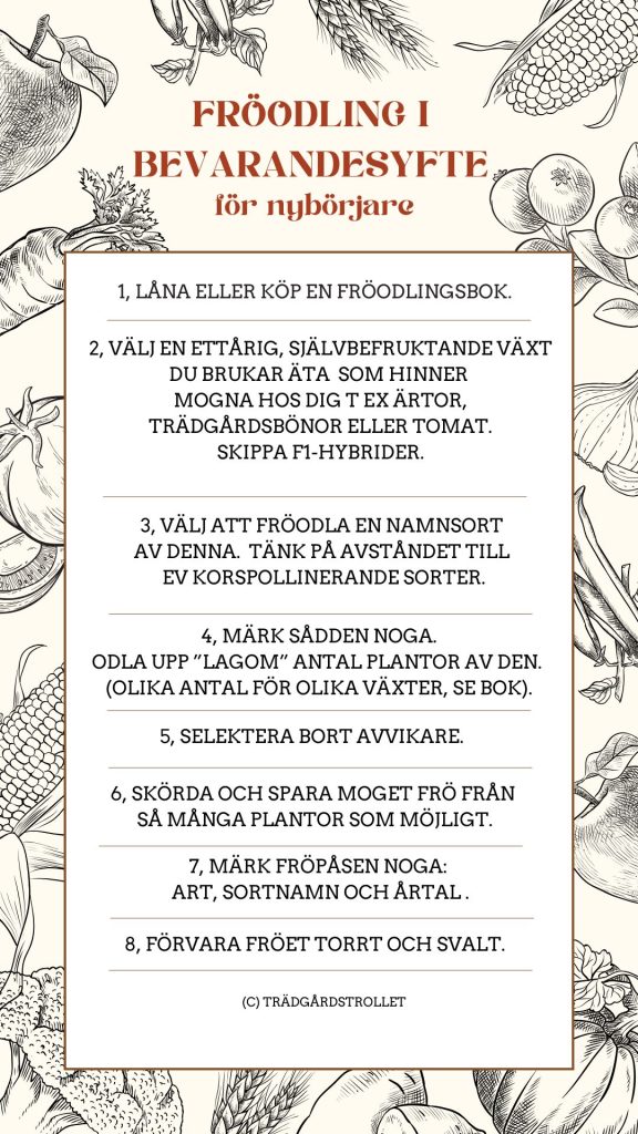 Jag hoppas att de här checklistorna kan sänka tröskeln och funka som en introduktion för dig som vill komma igång med att odla från frö till frö. Att checklistan kan få vara som en mumsig liten förrätt som ger mersmak och gör det lättare för dig att välja gröda från vår världs underbara mångfaldsbuffé så att du faktiskt börjar fröodla! Sätt igång bara! Det finns ca 5,3 miljoner fritidsodlare i Sverige idag och de allra flesta betraktar frö som en engångsprodukt… Jättesynd! Det behöver vi ändra på. Att ”bara spara frö” är en bra början men att faktiskt lära sig fröodla i bevarandesyfte på riktigt är så mycket bättre. Och helt nödvändigt om vi ska kunna hålla igång våra favoritsorter även i framtiden.