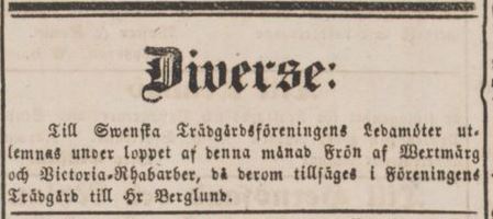 Rabarbern salufördes sedan i många decennier med hjälp av en receptsamling som spreds via trädgårdsföreningar och priskuranter. Stockholmsbaserade Tjäders fröhandel var särskilt betydelsefull för att popularisera grödan och de odlade också rabarber i större skala i huvudstaden under 1800-talets andra hälft.