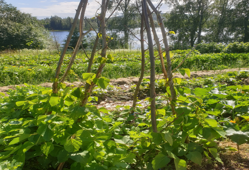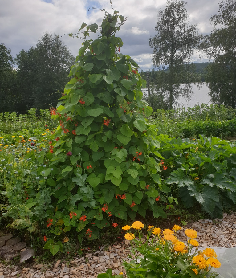 Med åren har vi börjat älska dem mer och mer och det är alltid lika roligt att hitta på rosenböninstallationer i köksträdgården! I somras försökte med med krocketliknande portaler som tyvärr blev för veka. Året före det (se bild) gjorde vi en tipi-liknande konstruktion som höll hela säsongen! Och nästa år fnular vi på armeringsnätsportaler över två bäddar.