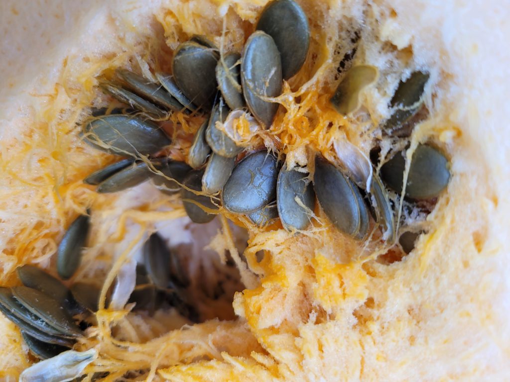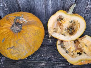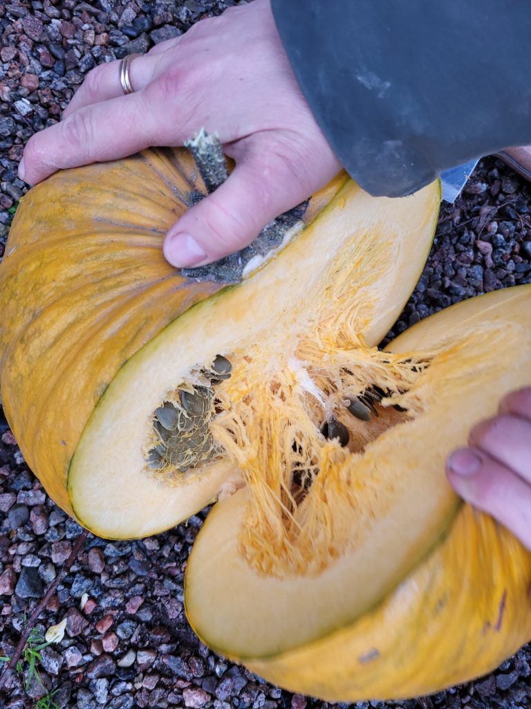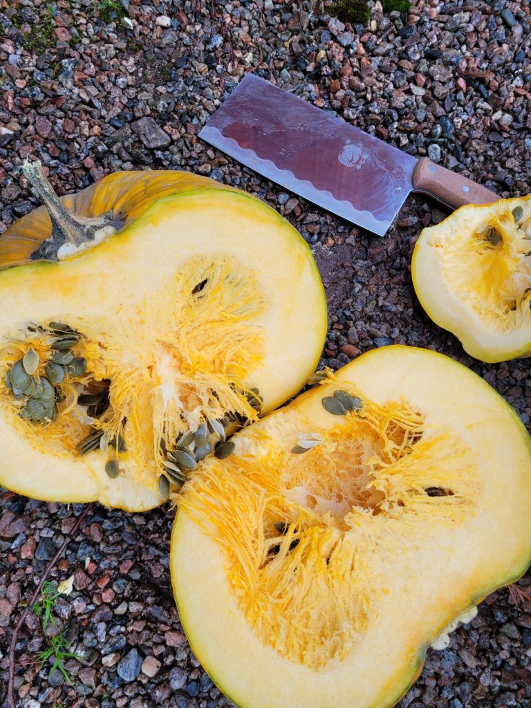 Det känns alltid lite högtidligt och spännande att öppna en lagrad pumpa…. Jag är alltid nyfiken på hur många frön som finns inuti.